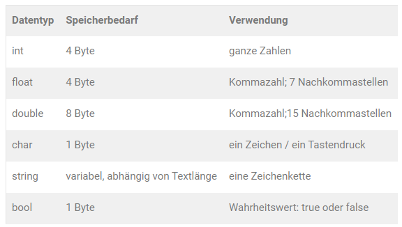 Im Bild sind wichtige Datentypen aufgelistet.