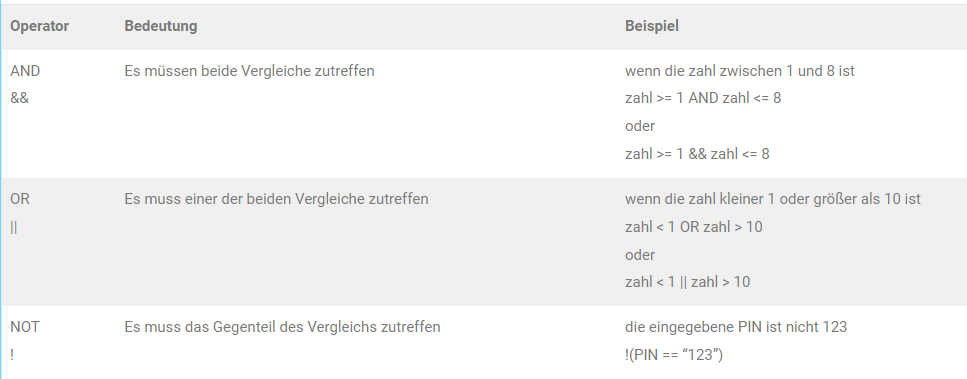 Wir halten fest: wenn wir einen alternativen Programmablauf haben wollen, müssen wir einen Vergleich formulieren. Und dieser umfasst den Vergleich von genau zwei Werten. Aber was ist, wenn mehr als eine Bedingung zutreffen muss oder kann, um eine Menge von Anweisungen auszuführen oder nicht?