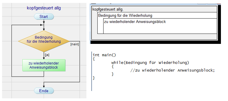 Die kopfgesteuerte Schleife wird verwendet, wenn man nicht weiß, ob ein Anweisungsblock überhaupt ausgeführt werden soll. Dazu wird vor dem ersten Ausführen geprüft, ob die Bedingung für die Wiederholung zutrifft.