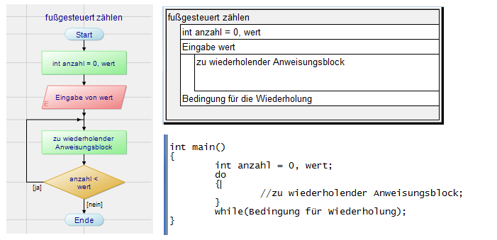 Hier der allgemeine Entwurf für eine fußgesteuerte Schleife zum Zählen von Wiederholungen. Beachte: die Anweisungen werden hier mindestens einmal ausgeführt.